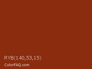 RYB 140,53,15 Color is a dark red color and the nearest color is Kobe #882d17. Hex code #8c2c0f and RGB value is rgb(140,44,15). In RGB color space, this color is composed of 55% red, 17% green, 6% blue, In CMYK color space, this color is composed of 0% cyan, 69% magenta, 89% yellow , 45% black , In HSL color space, this color has a hue angle of 14° , 81% saturation and 30% lightness.