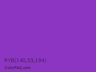 RYB 140,53,194 Color is a normal purple color and the nearest color is Dark Orchid #9932cc. Hex code #8c35c2 and RGB value is rgb(140,53,194). In RGB color space, this color is composed of 55% red, 21% green, 76% blue, In CMYK color space, this color is composed of 28% cyan, 73% magenta, 0% yellow , 24% black , In HSL color space, this color has a hue angle of 277° , 57% saturation and 48% lightness.