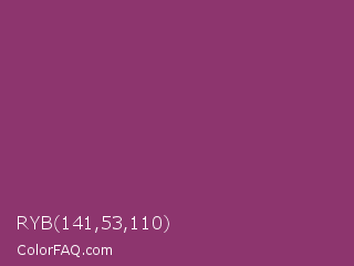 RYB 141,53,110 Color is a normal magenta color and the nearest color is Razzmic Berry Crayola #843179. Hex code #8d356e and RGB value is rgb(141,53,110). In RGB color space, this color is composed of 55% red, 21% green, 43% blue, In CMYK color space, this color is composed of 0% cyan, 62% magenta, 22% yellow , 45% black , In HSL color space, this color has a hue angle of 321° , 45% saturation and 38% lightness.