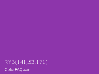 RYB 141,53,171 Color is a normal purple color and the nearest color is Purpureus #9a4eae. Hex code #8d35ab and RGB value is rgb(141,53,171). In RGB color space, this color is composed of 55% red, 21% green, 67% blue, In CMYK color space, this color is composed of 18% cyan, 69% magenta, 0% yellow , 33% black , In HSL color space, this color has a hue angle of 285° , 53% saturation and 44% lightness.