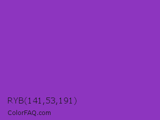 RYB 141,53,191 Color is a normal purple color and the nearest color is Dark Orchid #9932cc. Hex code #8d35bf and RGB value is rgb(141,53,191). In RGB color space, this color is composed of 55% red, 21% green, 75% blue, In CMYK color space, this color is composed of 26% cyan, 72% magenta, 0% yellow , 25% black , In HSL color space, this color has a hue angle of 278° , 57% saturation and 48% lightness.