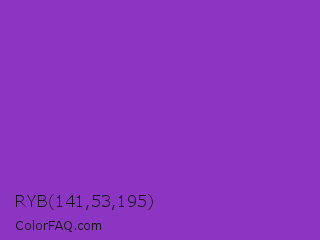 RYB 141,53,195 Color is a normal purple color and the nearest color is Dark Orchid #9932cc. Hex code #8d35c3 and RGB value is rgb(141,53,195). In RGB color space, this color is composed of 55% red, 21% green, 76% blue, In CMYK color space, this color is composed of 28% cyan, 73% magenta, 0% yellow , 24% black , In HSL color space, this color has a hue angle of 277° , 57% saturation and 49% lightness.