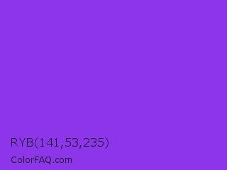 RYB 141,53,235 Color is a normal violet color and the nearest color is Blue Violet #8a2be2. Hex code #8d35eb and RGB value is rgb(141,53,235). In RGB color space, this color is composed of 55% red, 21% green, 92% blue, In CMYK color space, this color is composed of 40% cyan, 77% magenta, 0% yellow , 8% black , In HSL color space, this color has a hue angle of 269° , 82% saturation and 56% lightness.