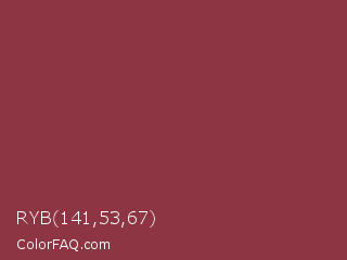RYB 141,53,67 Color is a normal red color and the nearest color is Solid Pink #893843. Hex code #8d3543 and RGB value is rgb(141,53,67). In RGB color space, this color is composed of 55% red, 21% green, 26% blue, In CMYK color space, this color is composed of 0% cyan, 62% magenta, 52% yellow , 45% black , In HSL color space, this color has a hue angle of 350° , 45% saturation and 38% lightness.