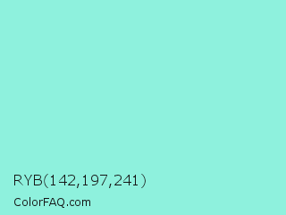 RYB 142,197,241 Color is a light cyan color and the nearest color is Riptide #8be6d8. Hex code #8ef1dd and RGB value is rgb(142,241,221). In RGB color space, this color is composed of 56% red, 95% green, 87% blue, In CMYK color space, this color is composed of 41% cyan, 0% magenta, 8% yellow , 5% black , In HSL color space, this color has a hue angle of 168° , 78% saturation and 75% lightness.