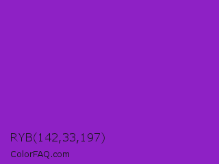 RYB 142,33,197 Color is a normal purple color and the nearest color is Dark Orchid #9932cc. Hex code #8e21c5 and RGB value is rgb(142,33,197). In RGB color space, this color is composed of 56% red, 13% green, 77% blue, In CMYK color space, this color is composed of 28% cyan, 83% magenta, 0% yellow , 23% black , In HSL color space, this color has a hue angle of 280° , 71% saturation and 45% lightness.