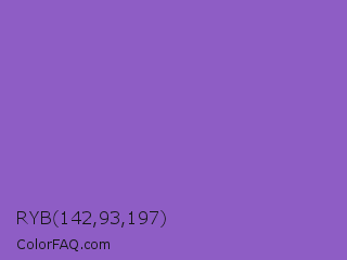 RYB 142,93,197 Color is a normal violet color and the nearest color is Amethyst #9966cc. Hex code #8e5dc5 and RGB value is rgb(142,93,197). In RGB color space, this color is composed of 56% red, 36% green, 77% blue, In CMYK color space, this color is composed of 28% cyan, 53% magenta, 0% yellow , 23% black , In HSL color space, this color has a hue angle of 268° , 47% saturation and 57% lightness.