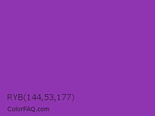 RYB 144,53,177 Color is a normal purple color and the nearest color is Purpureus #9a4eae. Hex code #9035b1 and RGB value is rgb(144,53,177). In RGB color space, this color is composed of 56% red, 21% green, 69% blue, In CMYK color space, this color is composed of 19% cyan, 70% magenta, 0% yellow , 31% black , In HSL color space, this color has a hue angle of 284° , 54% saturation and 45% lightness.