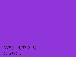 RYB 144,53,218 Color is a normal purple color and the nearest color is Blue Violet #8a2be2. Hex code #9035da and RGB value is rgb(144,53,218). In RGB color space, this color is composed of 56% red, 21% green, 85% blue, In CMYK color space, this color is composed of 34% cyan, 76% magenta, 0% yellow , 15% black , In HSL color space, this color has a hue angle of 273° , 69% saturation and 53% lightness.