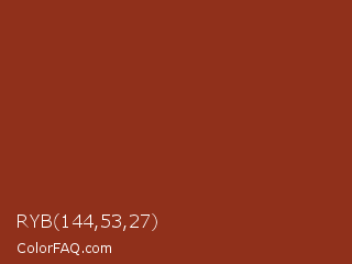 RYB 144,53,27 Color is a normal red color and the nearest color is Kobe #882d17. Hex code #90301b and RGB value is rgb(144,48,27). In RGB color space, this color is composed of 56% red, 19% green, 11% blue, In CMYK color space, this color is composed of 0% cyan, 67% magenta, 81% yellow , 44% black , In HSL color space, this color has a hue angle of 11° , 68% saturation and 34% lightness.