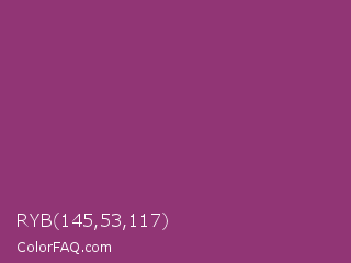 RYB 145,53,117 Color is a normal magenta color and the nearest color is Razzmic Berry Crayola #843179. Hex code #913575 and RGB value is rgb(145,53,117). In RGB color space, this color is composed of 57% red, 21% green, 46% blue, In CMYK color space, this color is composed of 0% cyan, 63% magenta, 19% yellow , 43% black , In HSL color space, this color has a hue angle of 318° , 46% saturation and 39% lightness.