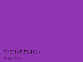RYB 145,53,181 Color is a normal purple color and the nearest color is Dark Orchid #9932cc. Hex code #9135b5 and RGB value is rgb(145,53,181). In RGB color space, this color is composed of 57% red, 21% green, 71% blue, In CMYK color space, this color is composed of 20% cyan, 71% magenta, 0% yellow , 29% black , In HSL color space, this color has a hue angle of 283° , 55% saturation and 46% lightness.