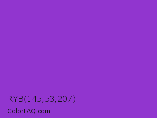 RYB 145,53,207 Color is a normal purple color and the nearest color is Dark Orchid #9932cc. Hex code #9135cf and RGB value is rgb(145,53,207). In RGB color space, this color is composed of 57% red, 21% green, 81% blue, In CMYK color space, this color is composed of 30% cyan, 74% magenta, 0% yellow , 19% black , In HSL color space, this color has a hue angle of 276° , 62% saturation and 51% lightness.