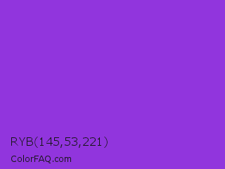 RYB 145,53,221 Color is a normal purple color and the nearest color is Blue Violet #8a2be2. Hex code #9135dd and RGB value is rgb(145,53,221). In RGB color space, this color is composed of 57% red, 21% green, 87% blue, In CMYK color space, this color is composed of 34% cyan, 76% magenta, 0% yellow , 13% black , In HSL color space, this color has a hue angle of 273° , 71% saturation and 54% lightness.