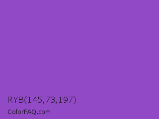 RYB 145,73,197 Color is a normal purple color and the nearest color is Deep Lilac #9955bb. Hex code #9149c5 and RGB value is rgb(145,73,197). In RGB color space, this color is composed of 57% red, 29% green, 77% blue, In CMYK color space, this color is composed of 26% cyan, 63% magenta, 0% yellow , 23% black , In HSL color space, this color has a hue angle of 275° , 52% saturation and 53% lightness.