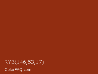 RYB 146,53,17 Color is a normal red color and the nearest color is Kobe #882d17. Hex code #922d11 and RGB value is rgb(146,45,17). In RGB color space, this color is composed of 57% red, 18% green, 7% blue, In CMYK color space, this color is composed of 0% cyan, 69% magenta, 88% yellow , 43% black , In HSL color space, this color has a hue angle of 13° , 79% saturation and 32% lightness.