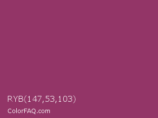 RYB 147,53,103 Color is a normal rose color and the nearest color is Vin Rouge #983d61. Hex code #933567 and RGB value is rgb(147,53,103). In RGB color space, this color is composed of 58% red, 21% green, 40% blue, In CMYK color space, this color is composed of 0% cyan, 64% magenta, 30% yellow , 42% black , In HSL color space, this color has a hue angle of 328° , 47% saturation and 39% lightness.