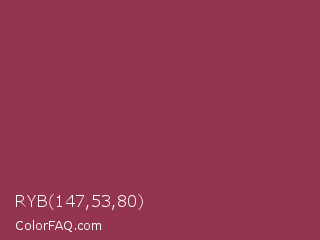 RYB 147,53,80 Color is a normal rose color and the nearest color is Quinacridone Magenta #8e3a59. Hex code #933550 and RGB value is rgb(147,53,80). In RGB color space, this color is composed of 58% red, 21% green, 31% blue, In CMYK color space, this color is composed of 0% cyan, 64% magenta, 46% yellow , 42% black , In HSL color space, this color has a hue angle of 343° , 47% saturation and 39% lightness.
