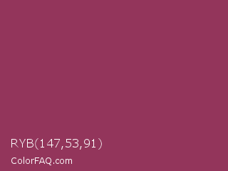 RYB 147,53,91 Color is a normal rose color and the nearest color is Quinacridone Magenta #8e3a59. Hex code #93355b and RGB value is rgb(147,53,91). In RGB color space, this color is composed of 58% red, 21% green, 36% blue, In CMYK color space, this color is composed of 0% cyan, 64% magenta, 38% yellow , 42% black , In HSL color space, this color has a hue angle of 336° , 47% saturation and 39% lightness.