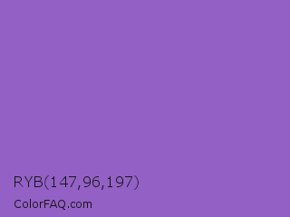 RYB 147,96,197 Color is a normal violet color and the nearest color is Amethyst #9966cc. Hex code #9360c5 and RGB value is rgb(147,96,197). In RGB color space, this color is composed of 58% red, 38% green, 77% blue, In CMYK color space, this color is composed of 25% cyan, 51% magenta, 0% yellow , 23% black , In HSL color space, this color has a hue angle of 270° , 47% saturation and 57% lightness.