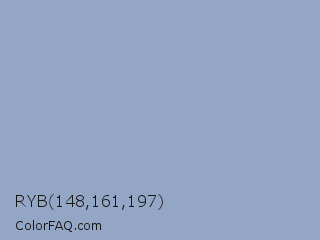 RYB 148,161,197 Color is a light blue color and the nearest color is Nepal #8eabc1. Hex code #94a6c5 and RGB value is rgb(148,166,197). In RGB color space, this color is composed of 58% red, 65% green, 77% blue, In CMYK color space, this color is composed of 25% cyan, 16% magenta, 0% yellow , 23% black , In HSL color space, this color has a hue angle of 218° , 30% saturation and 68% lightness.