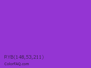 RYB 148,53,211 Color is a normal purple color and the nearest color is Dark Orchid #9932cc. Hex code #9435d3 and RGB value is rgb(148,53,211). In RGB color space, this color is composed of 58% red, 21% green, 83% blue, In CMYK color space, this color is composed of 30% cyan, 75% magenta, 0% yellow , 17% black , In HSL color space, this color has a hue angle of 276° , 64% saturation and 52% lightness.