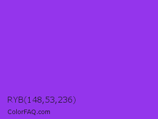 RYB 148,53,236 Color is a normal purple color and the nearest color is Blue Violet #8a2be2. Hex code #9435ec and RGB value is rgb(148,53,236). In RGB color space, this color is composed of 58% red, 21% green, 93% blue, In CMYK color space, this color is composed of 37% cyan, 78% magenta, 0% yellow , 7% black , In HSL color space, this color has a hue angle of 271° , 83% saturation and 57% lightness.