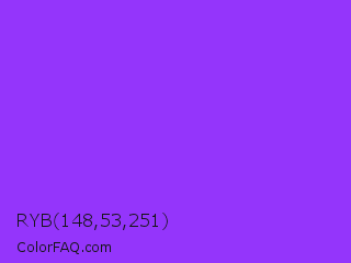 RYB 148,53,251 Color is a normal violet color and the nearest color is Veronica #a020f0. Hex code #9435fb and RGB value is rgb(148,53,251). In RGB color space, this color is composed of 58% red, 21% green, 98% blue, In CMYK color space, this color is composed of 41% cyan, 79% magenta, 0% yellow , 2% black , In HSL color space, this color has a hue angle of 269° , 96% saturation and 60% lightness.