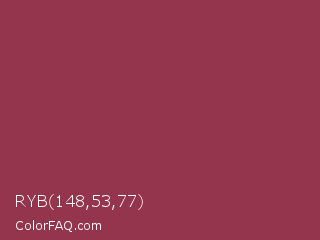 RYB 148,53,77 Color is a normal red color and the nearest color is Camelot #893456. Hex code #94354d and RGB value is rgb(148,53,77). In RGB color space, this color is composed of 58% red, 21% green, 30% blue, In CMYK color space, this color is composed of 0% cyan, 64% magenta, 48% yellow , 42% black , In HSL color space, this color has a hue angle of 345° , 47% saturation and 39% lightness.