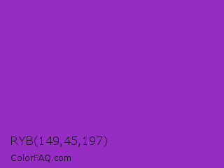 RYB 149,45,197 Color is a normal purple color and the nearest color is Dark Orchid #9932cc. Hex code #952dc5 and RGB value is rgb(149,45,197). In RGB color space, this color is composed of 58% red, 18% green, 77% blue, In CMYK color space, this color is composed of 24% cyan, 77% magenta, 0% yellow , 23% black , In HSL color space, this color has a hue angle of 281° , 63% saturation and 47% lightness.
