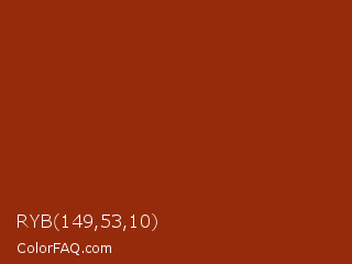 RYB 149,53,10 Color is a normal red color and the nearest color is Tabasco #a02712. Hex code #952b0a and RGB value is rgb(149,43,10). In RGB color space, this color is composed of 58% red, 17% green, 4% blue, In CMYK color space, this color is composed of 0% cyan, 71% magenta, 93% yellow , 42% black , In HSL color space, this color has a hue angle of 14° , 87% saturation and 31% lightness.