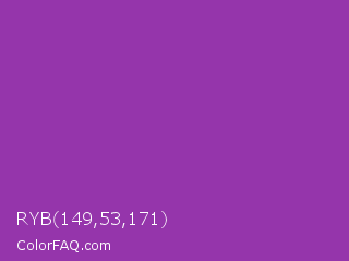 RYB 149,53,171 Color is a normal purple color and the nearest color is Purpureus #9a4eae. Hex code #9535ab and RGB value is rgb(149,53,171). In RGB color space, this color is composed of 58% red, 21% green, 67% blue, In CMYK color space, this color is composed of 13% cyan, 69% magenta, 0% yellow , 33% black , In HSL color space, this color has a hue angle of 289° , 53% saturation and 44% lightness.