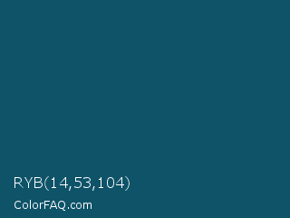 RYB 14,53,104 Color is a dark blue color and the nearest color is Deep Sea Green #095859. Hex code #0e5368 and RGB value is rgb(14,83,104). In RGB color space, this color is composed of 5% red, 33% green, 41% blue, In CMYK color space, this color is composed of 87% cyan, 20% magenta, 0% yellow , 59% black , In HSL color space, this color has a hue angle of 194° , 76% saturation and 23% lightness.