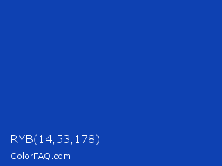 RYB 14,53,178 Color is a normal blue color and the nearest color is Cobalt #0047ab. Hex code #0e41b2 and RGB value is rgb(14,65,178). In RGB color space, this color is composed of 5% red, 25% green, 70% blue, In CMYK color space, this color is composed of 92% cyan, 63% magenta, 0% yellow , 30% black , In HSL color space, this color has a hue angle of 221° , 85% saturation and 38% lightness.
