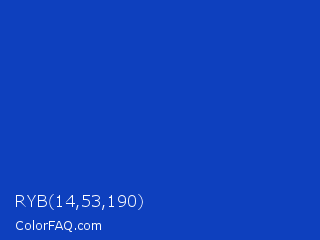 RYB 14,53,190 Color is a normal blue color and the nearest color is Persian Blue #1c39bb. Hex code #0e40be and RGB value is rgb(14,64,190). In RGB color space, this color is composed of 5% red, 25% green, 75% blue, In CMYK color space, this color is composed of 93% cyan, 66% magenta, 0% yellow , 25% black , In HSL color space, this color has a hue angle of 223° , 86% saturation and 40% lightness.