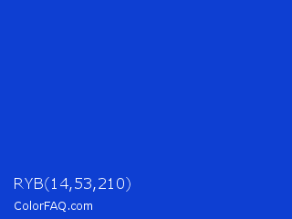 RYB 14,53,210 Color is a normal blue color and the nearest color is New Car #214fc6. Hex code #0e3fd2 and RGB value is rgb(14,63,210). In RGB color space, this color is composed of 5% red, 25% green, 82% blue, In CMYK color space, this color is composed of 93% cyan, 70% magenta, 0% yellow , 18% black , In HSL color space, this color has a hue angle of 225° , 88% saturation and 44% lightness.