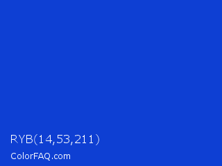 RYB 14,53,211 Color is a normal blue color and the nearest color is New Car #214fc6. Hex code #0e3fd3 and RGB value is rgb(14,63,211). In RGB color space, this color is composed of 5% red, 25% green, 83% blue, In CMYK color space, this color is composed of 93% cyan, 70% magenta, 0% yellow , 17% black , In HSL color space, this color has a hue angle of 225° , 88% saturation and 44% lightness.