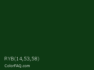 RYB 14,53,58 Color is a very dark green color and the nearest color is Palm Leaf #19330e. Hex code #0e3a14 and RGB value is rgb(14,58,20). In RGB color space, this color is composed of 5% red, 23% green, 8% blue, In CMYK color space, this color is composed of 76% cyan, 0% magenta, 66% yellow , 77% black , In HSL color space, this color has a hue angle of 128° , 61% saturation and 14% lightness.