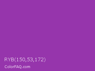 RYB 150,53,172 Color is a normal purple color and the nearest color is Purpureus #9a4eae. Hex code #9635ac and RGB value is rgb(150,53,172). In RGB color space, this color is composed of 59% red, 21% green, 67% blue, In CMYK color space, this color is composed of 13% cyan, 69% magenta, 0% yellow , 33% black , In HSL color space, this color has a hue angle of 289° , 53% saturation and 44% lightness.