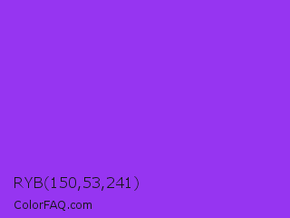 RYB 150,53,241 Color is a normal purple color and the nearest color is Blue Violet #8a2be2. Hex code #9635f1 and RGB value is rgb(150,53,241). In RGB color space, this color is composed of 59% red, 21% green, 95% blue, In CMYK color space, this color is composed of 38% cyan, 78% magenta, 0% yellow , 5% black , In HSL color space, this color has a hue angle of 271° , 87% saturation and 58% lightness.