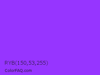 RYB 150,53,255 Color is a normal violet color and the nearest color is Veronica #a020f0. Hex code #9635ff and RGB value is rgb(150,53,255). In RGB color space, this color is composed of 59% red, 21% green, 100% blue, In CMYK color space, this color is composed of 41% cyan, 79% magenta, 0% yellow , 0% black , In HSL color space, this color has a hue angle of 269° , 100% saturation and 60% lightness.