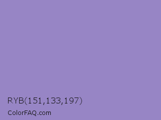 RYB 151,133,197 Color is a light indigo color and the nearest color is Lavender Purple #967bb6. Hex code #9785c5 and RGB value is rgb(151,133,197). In RGB color space, this color is composed of 59% red, 52% green, 77% blue, In CMYK color space, this color is composed of 23% cyan, 32% magenta, 0% yellow , 23% black , In HSL color space, this color has a hue angle of 257° , 36% saturation and 65% lightness.