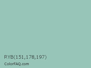 RYB 151,178,197 Color is a light green color and the nearest color is Shadow Green #9ac2b8. Hex code #97c5b7 and RGB value is rgb(151,197,183). In RGB color space, this color is composed of 59% red, 77% green, 72% blue, In CMYK color space, this color is composed of 23% cyan, 0% magenta, 7% yellow , 23% black , In HSL color space, this color has a hue angle of 162° , 28% saturation and 68% lightness.