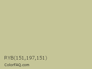 RYB 151,197,151 Color is a light yellow color and the nearest color is Pine Glade #c7cd90. Hex code #c5c597 and RGB value is rgb(197,197,151). In RGB color space, this color is composed of 77% red, 77% green, 59% blue, In CMYK color space, this color is composed of 0% cyan, 0% magenta, 23% yellow , 23% black , In HSL color space, this color has a hue angle of 60° , 28% saturation and 68% lightness.