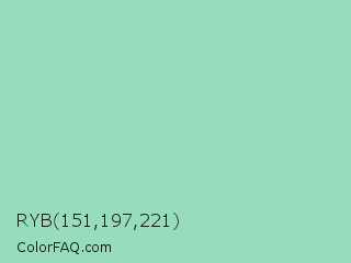 RYB 151,197,221 Color is a light green color and the nearest color is Algae Green #93dfb8. Hex code #97ddbc and RGB value is rgb(151,221,188). In RGB color space, this color is composed of 59% red, 87% green, 74% blue, In CMYK color space, this color is composed of 32% cyan, 0% magenta, 15% yellow , 13% black , In HSL color space, this color has a hue angle of 152° , 51% saturation and 73% lightness.