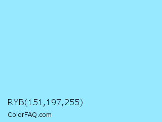 RYB 151,197,255 Color is a light cyan color and the nearest color is Anakiwa #9de5ff. Hex code #97e9ff and RGB value is rgb(151,233,255). In RGB color space, this color is composed of 59% red, 91% green, 100% blue, In CMYK color space, this color is composed of 41% cyan, 9% magenta, 0% yellow , 0% black , In HSL color space, this color has a hue angle of 193° , 100% saturation and 80% lightness.