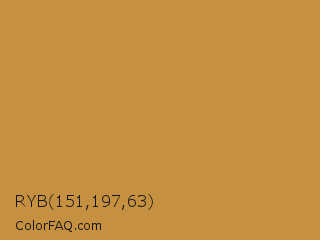 RYB 151,197,63 Color is a normal orange color and the nearest color is Peru #cd853f. Hex code #c5903f and RGB value is rgb(197,144,63). In RGB color space, this color is composed of 77% red, 56% green, 25% blue, In CMYK color space, this color is composed of 0% cyan, 27% magenta, 68% yellow , 23% black , In HSL color space, this color has a hue angle of 36° , 54% saturation and 51% lightness.
