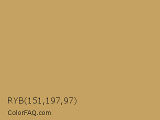 RYB 151,197,97 Color is a normal orange color and the nearest color is Brown Yellow #cc9966. Hex code #c5a261 and RGB value is rgb(197,162,97). In RGB color space, this color is composed of 77% red, 64% green, 38% blue, In CMYK color space, this color is composed of 0% cyan, 18% magenta, 51% yellow , 23% black , In HSL color space, this color has a hue angle of 39° , 46% saturation and 58% lightness.