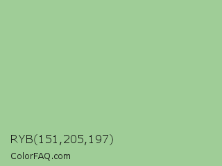 RYB 151,205,197 Color is a light green color and the nearest color is Eton Blue #96c8a2. Hex code #9fcd97 and RGB value is rgb(159,205,151). In RGB color space, this color is composed of 62% red, 80% green, 59% blue, In CMYK color space, this color is composed of 22% cyan, 0% magenta, 26% yellow , 20% black , In HSL color space, this color has a hue angle of 111° , 35% saturation and 70% lightness.