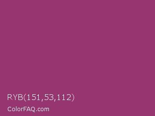 RYB 151,53,112 Color is a normal magenta color and the nearest color is Rouge #a23b6c. Hex code #973570 and RGB value is rgb(151,53,112). In RGB color space, this color is composed of 59% red, 21% green, 44% blue, In CMYK color space, this color is composed of 0% cyan, 65% magenta, 26% yellow , 41% black , In HSL color space, this color has a hue angle of 324° , 48% saturation and 40% lightness.